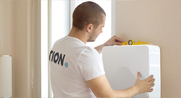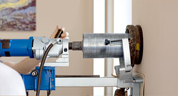 Монтажная бригада делает отверстие в стене при помощи установки алмазного бурения — быстро и без грязи. Внутри отверстие утепляется и шумоизолируется специальным материалом, а со стороны улицы закрывается решеткой.