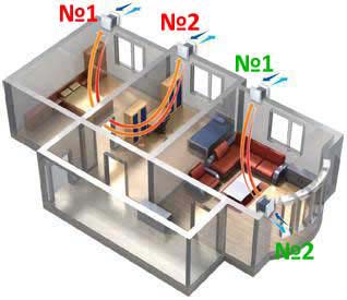 Приборы монтируются в наружной стене здания. Каждый из приборов обеспечивает свежим воздухом помещение площадью до 30 м2 при высоте потолков 2,5-2,6 м (около 80 м3). Если по объему помещения одного прибора недостаточно, устанавливать 2 и более УВРК. При этом желательно настроить приборы для работы в противофазе (согласно руководству пользователя), чтобы воздух стремился пройти весь путь от одного прибора к другому. Это обеспечит более эффективный воздухообмен, надо лишь предусмотреть щель под дверью, соединяющей комнаты, или переточную решетку в двери. В больших помещениях с большим числом людей могут быть размещены несколько пар приборов.