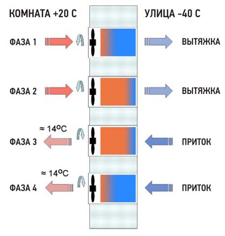 Рекуператоры УВРК работают по фазам. На рисунке мы видим, как на первой и второй фазах происходит вытяжка и прогрев рекуператора от контакта с теплым воздухом. На фазах 3 и 4 происходит приток с прогревом свежего приточного воздуха без энергозатрат.