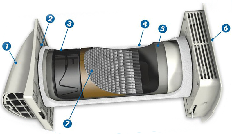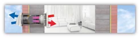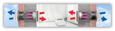 Теплый использованный воздух отводится из помещения наружу в течение 70 секунд и нагревает при этом керамический элемент. После этого устройство меняет направление подачи воздуха: теперь в помещение поступает свежий воздух снаружи и при этом подогревается за счет тепла, аккумулированного в керамическом элементе.