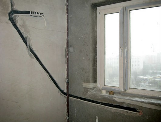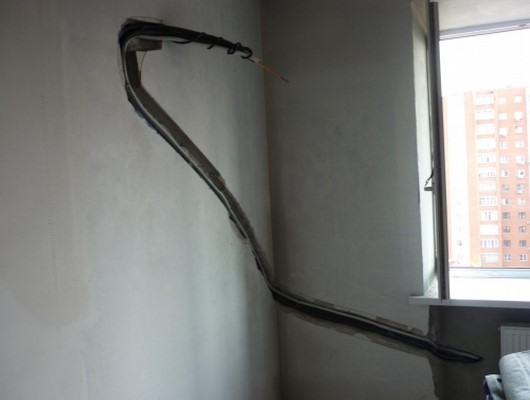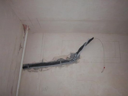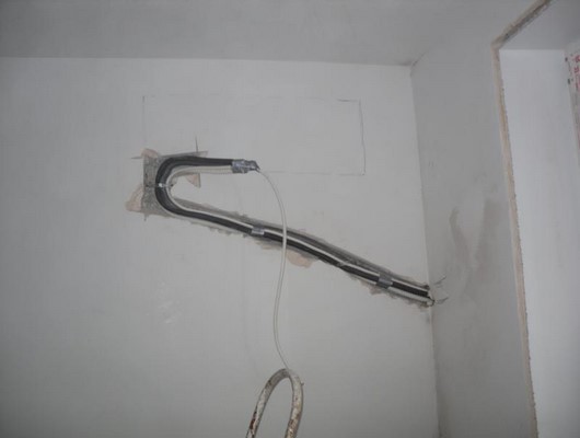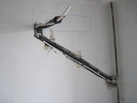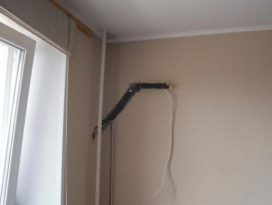 - Межблочные коммуникации проводятся через отверстие в стене. С внутренней стороны они убираются в белый пластиковый корпус. Это эстетичное решение, которое не испортит дизайн интерьера.